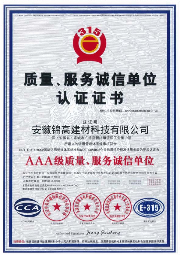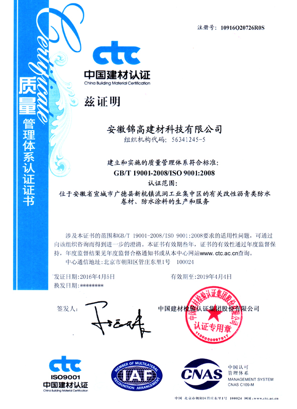 安徽锦高建材科技有限公司通过ISO9001质量管理体系认证