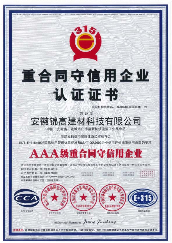 安徽锦高建材科技有限公司通过ISO9001质量管理体系认证